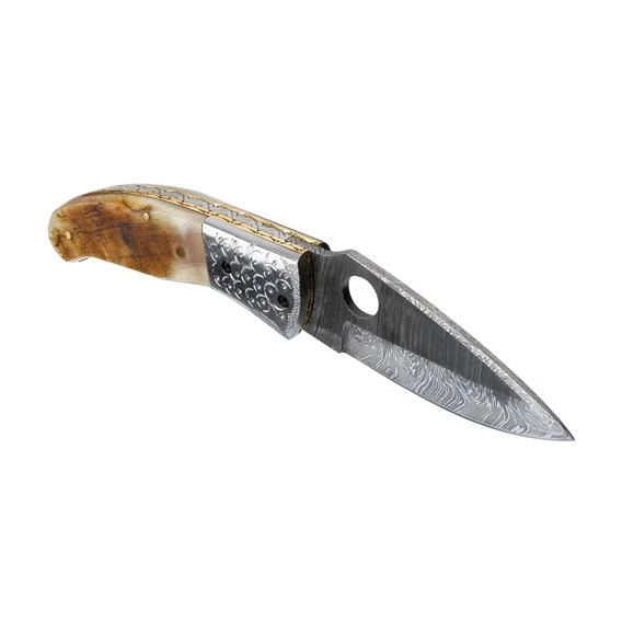 Dieses Taschenmesser mit Damast Klinge ist leicht zu schärfen und punktet mit Robustheit und nicht zuletzt einer wunderschönen Optik. Das Griffstück ist aus Horn gefertigt und liegt angenehm in der Hand.
