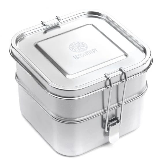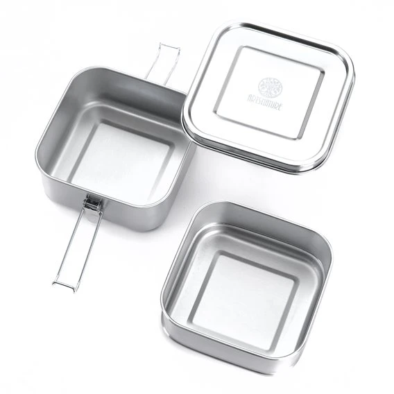Der Umwelt und des unverfälschten Geschmacks zu Liebe! Diese hochwertige Edelstahl Lunchbox ist eine gute Alternative zur Plastik, Brotdose und Einwegverpackung. Sie ist BPA-frei, geschmacks- und geruchsneutral und einfach zu reinigen (auch in der Spülmaschine). Ideal für die Vesperpause im Kindergarten, Schule, Beruf oder für die Aufbewahrung von Käse- und Wurstaufschnitt im Kühlschrank. Die obere Dose ist auslaufsicher und eignet sich z.B. für den Transport von Joghurt oder Dressing, während in der unteren Etage trockene Lebensmittel wie z.B. Müsli und Salat ihren Platz finden.