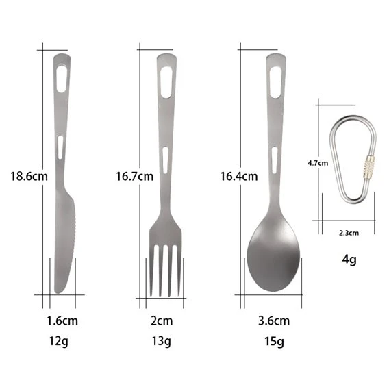 Messer, Gabel, Löffel – vereint in einem praktischen Set. Dieses Reiseset ist aus Titanium gefertigt. Einem besonders leichtem und robusten Material. Ausgestattet mit einem Karabiner, lässt es sich einfach am Rucksack oder im Wohnmobil befestigen. Platzsparend, Gewichtsparend – kurzum: Einfach praktisch für unterwegs!