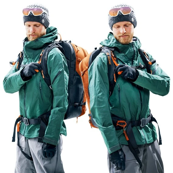 Neben Hüftgurt und stufenlos verstellbarem Brustgurt verhindert die Beinschlaufe, das Abziehen des Rucksacks über den Kopf im Verschüttungsfall. Während des Tragens ist sie ohne Öffnen des Hüftgurtes einklippbar und erleichtert damit das Handling.