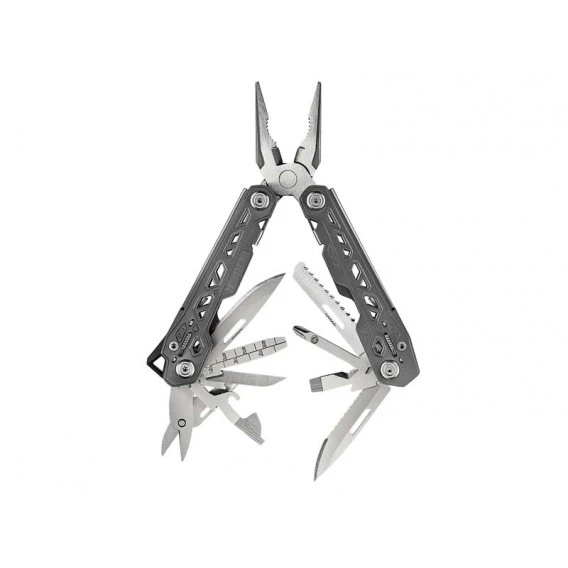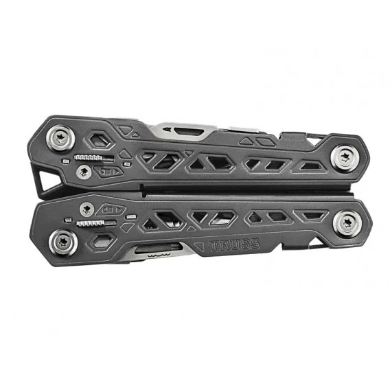 Das Gerber Multitool TRUSS ist überraschend kompakt und zugleich ein Riese in puncto Funktionalität: 17 Funktionen beherbergt das Tool. Im geschlossenen Zustand liegen die Werkzeuge außen für schnellen Zugriff. Alle Werkzeuge arretieren für hohe Sicherheit bei der Verwendung. Zum Lieferumfang gehört ein Nylonetui, das längs oder quer befestigt werden kann. 17 Funktionen: Spitzzange, normale Zange, Drahtschneider, glatte Klinge, Klinge mit Wellenschliff, Säge, Schere, kleiner/mittlerer/großer Flachschraubenzieher, Kreuzschraubendreher, Lineal, Feile, Abisolierer, Ahle, Dosenöffner, Kapselheber.
