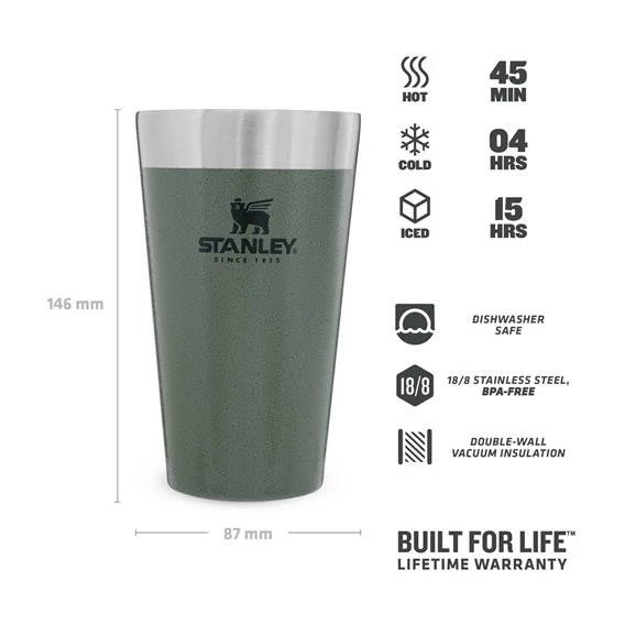 Stilvoll genießen mit dem Stanley ADVENTURE STACKING VACUUM PINT im klassischen Hammerschlag-Grün. Die neuen Varianten der Pint-Becher sind aus 18/8 Edelstahl, doppelwandig vakuumisoliert und spülmaschinenfest. Die bruchsicheren Edelstahlbecher sind ideale Outdoor-Begleiter. Getränke bleiben bis zu 4 Stunden kalt oder 45 Minuten heiß, mit Eiswürfeln befüllt bleiben Getränke sogar bis zu 15 Stunden kalt. Für unterwegs lassen sich die Adventure Vacuum Pint-Becher ineinander stapeln. Die Pint-Becher sind spülmaschinenfest.